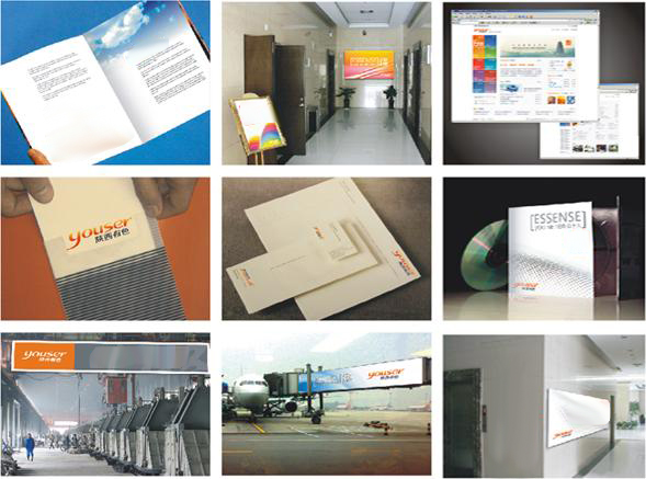 本部分展示了陕西有色的标志、辅助图形、理念在实际中的应用,其中包括:企业画册、品牌文化手册、员工培训手册、理念海报、明信片、邀请函、信纸、信封、名片、CD、包装盒、室内理念传播、厂区理念传播、户外广告、户外理念海报、展览展示、网站等。