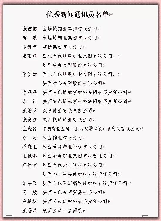 为进一步做好集团公司新闻信息报送工作,不断提高新闻发布质量,激发广大新闻通讯员写稿积极性,经集团公司党委研究,决定对2021年度新闻舆论工作中涌现出来的金钼集团张雪榕等18名优秀新闻通讯员予以通报表彰。各单位、集团公司总部机关党委可结合实际,给予受表彰的优秀通讯员一定的奖励。