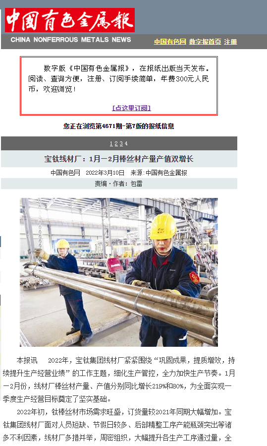 本报讯 2022年,宝钛集团线材厂紧紧围绕“巩固成果,提质增效,持续提升生产经营业绩”的工作主题,细化生产管控,全力加快生产节奏。1月—2月份,线材厂棒丝材产量、产值分别同比增长219%和80%,为全面实现一季度生产经营目标奠定了坚实基础。