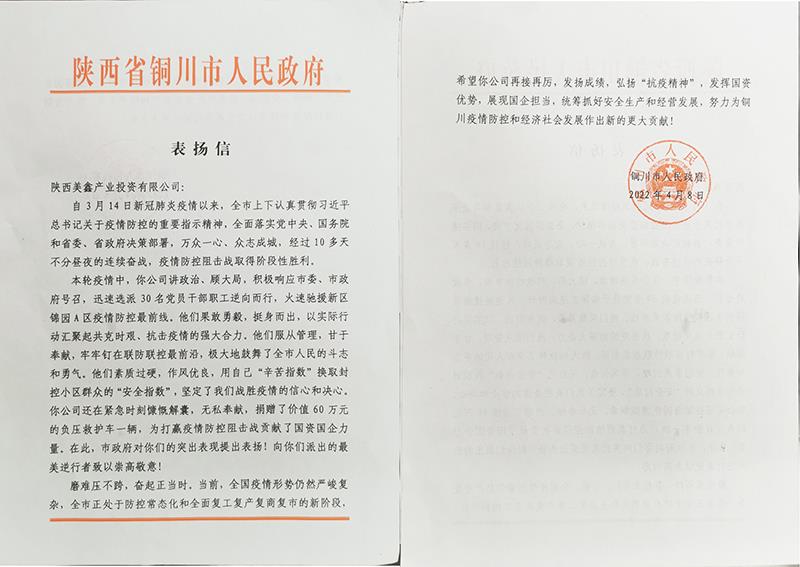 4月上旬,铜川市人民政府向陕西美鑫公司发来一封《表扬信》,对该公司积极参与铜川市3.14疫情防控工作付出的努力和做出的贡献表示高度的赞扬,对主动担当、勇于作为,防疫情、稳生产取得的成绩给予充分肯定。