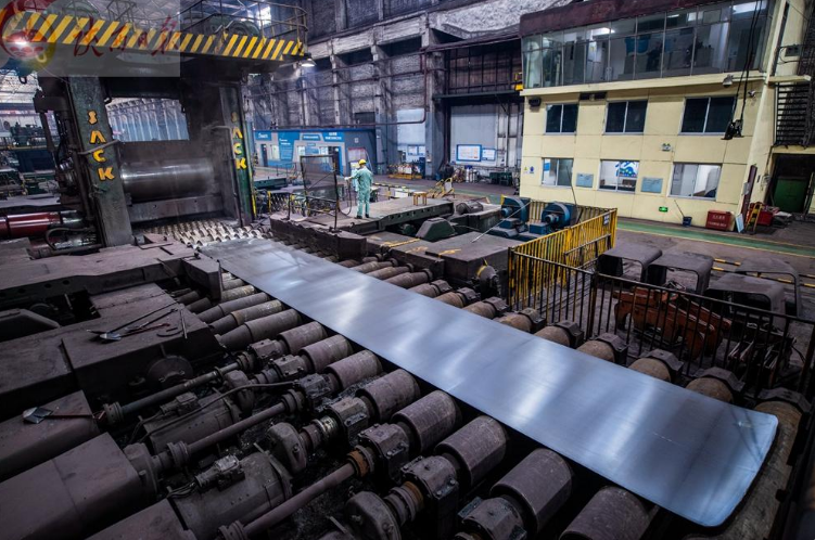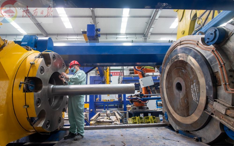 5月6日,在宝钛集团高品质钛锭、管材及型材生产线建设项目现场,技术人员使用百分表安装调试设备。
