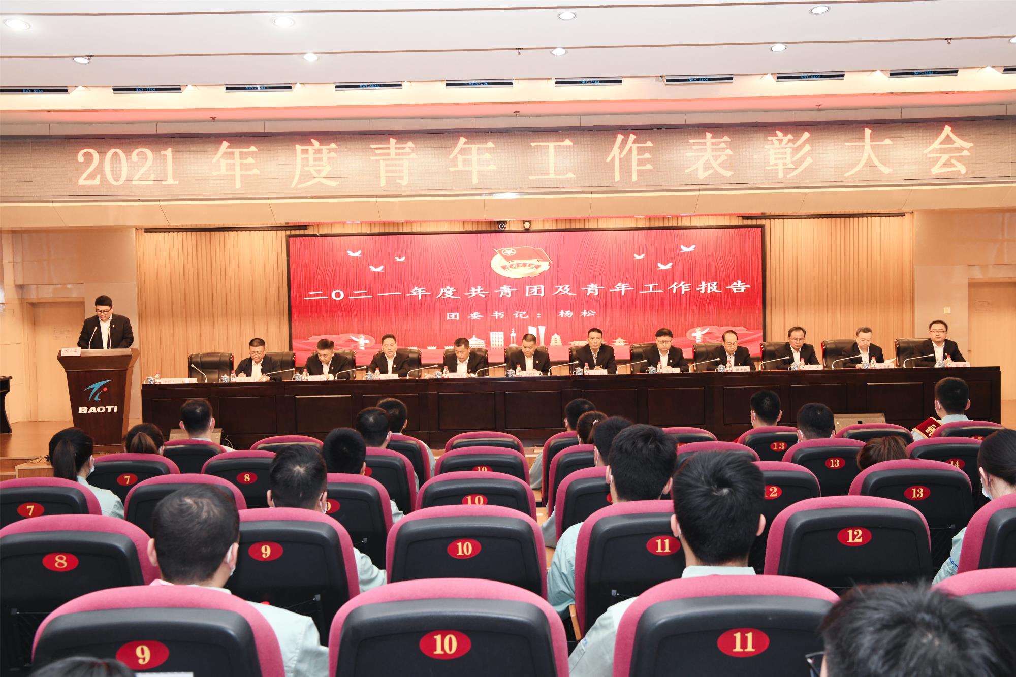 表彰会在嘹亮的国歌和团歌声中正式开始。杨松首先代表公司团委作工作报告。他号召青年职工与公司同呼吸、共命运,把握机遇、奋发向上,以良好的精神面貌和扎实的工作作风,为把宝钛建设成世界钛业强企贡献青春、智慧和力量。