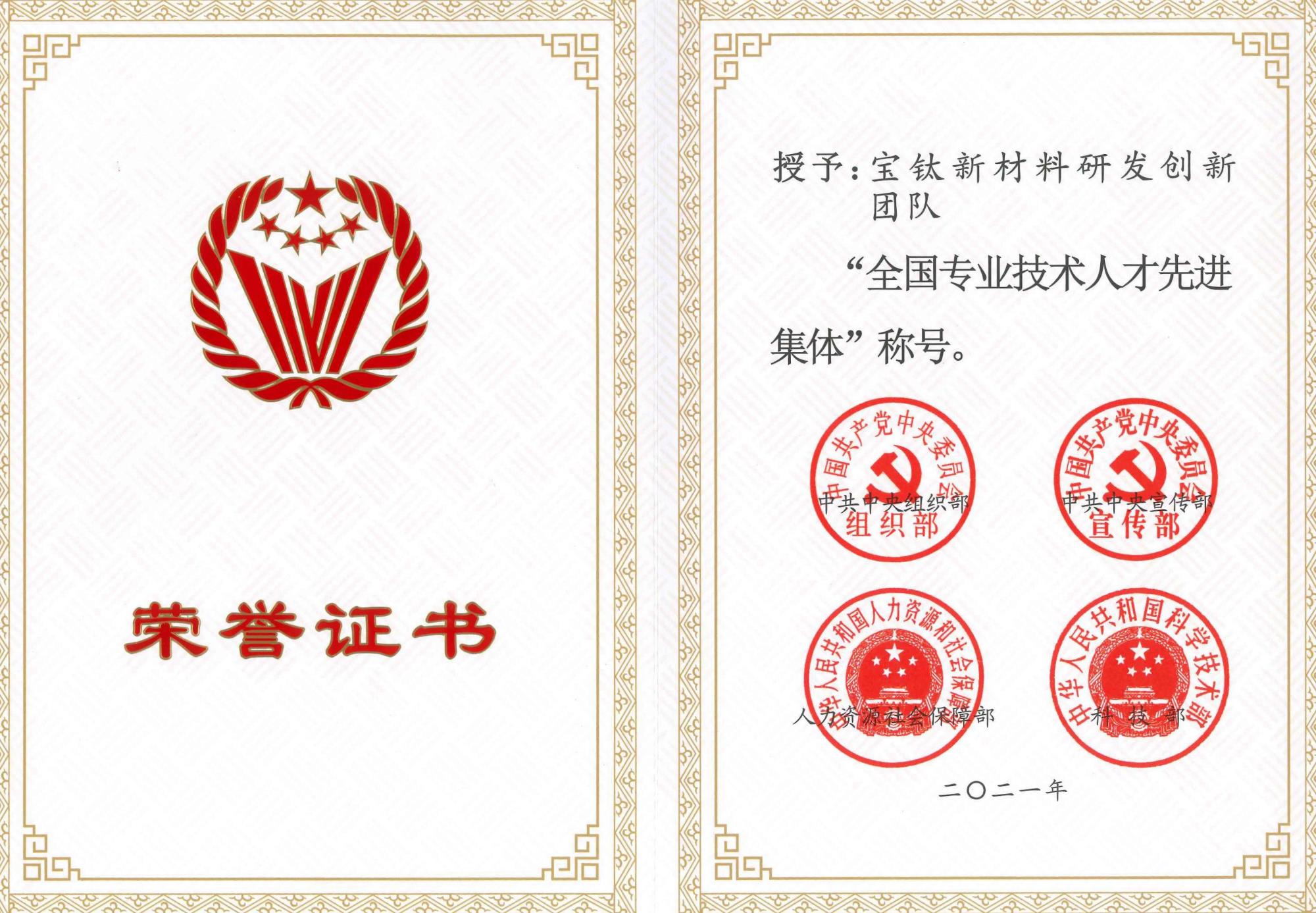 全国杰出专业技术人才及集体评选表彰由中共中央组织部、中共中央宣传部、人力资源社会保障部、科技部联合组织实施,每5年开展一次。此次获得表彰的全国专业技术人才先进集体同时有钟南山呼吸疾病防控团队、歼-15飞机研制团队等杰出人才集体,均为我国广大专业技术人才的优秀代表。2021年5月,在省人社厅、省国资委大力支持下,由伟德国际1949集团组织申报,宝钛新材料研发创新团队与全省众多优秀企业科研团队同台竞争,经过艰苦努力,冲出重围,取得代表全省企业参与国家评选的唯一名额,最终在国家四部委联合评选中脱颖而出。