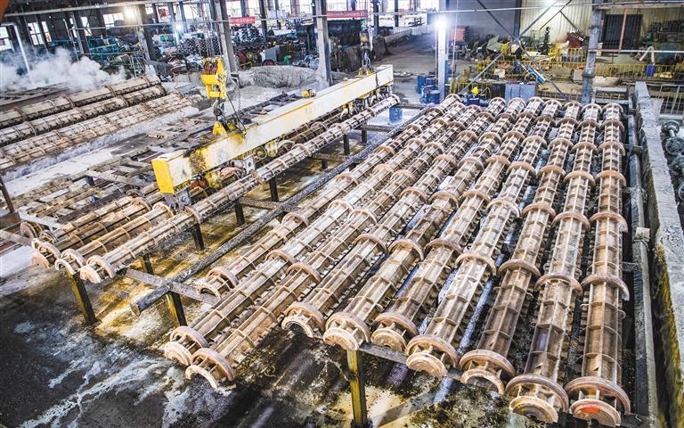 11月11日,工人在陕西有色万通建材有限公司混凝土管桩生产线上作业。目前,该公司可生产直径300毫米至800毫米规格预应力高强度混凝土管桩、空心方桩、预制楼梯等混凝土预制构件,产品广泛应用于建筑、公路、水利等工程领域。该公司是西北地区新型绿色建材龙头企业,今年前10个月实现产值1.13亿元。本报记者 袁景智摄