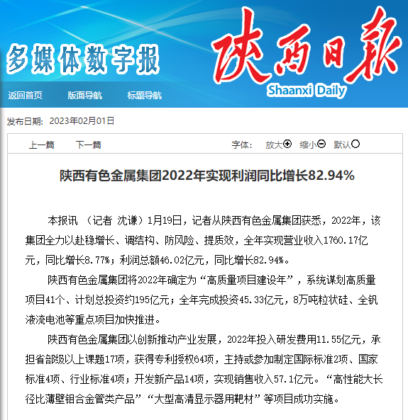 陕西日报:伟德国际1949集团2022年实现利润同比增长82.94%