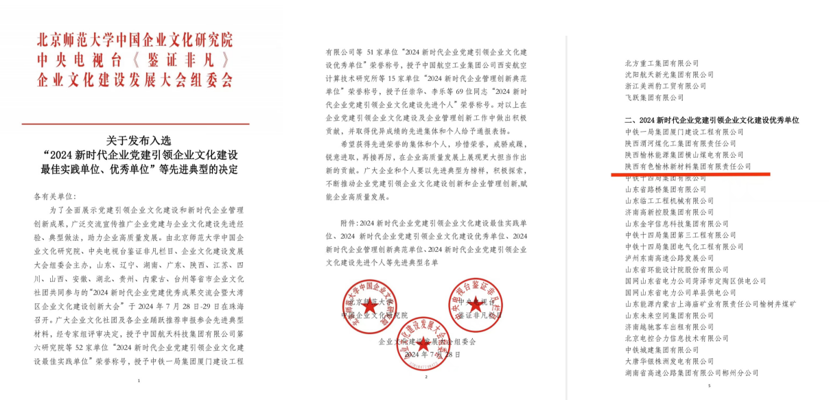 7月28日至29日,2024新时代企业党建优秀成果交流会暨大湾区企业文化建设创新大会在广东珠海召开。会上发布了“2024新时代企业党建引领企业文化建设最佳实践单位、优秀单位”等先进典型名单。通过专家评审,榆林新材料集团荣获“2024新时代企业党建引领企业文化建设优秀单位”。