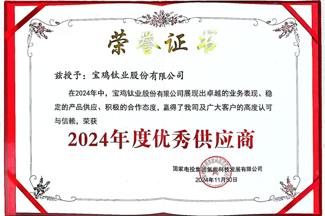 近日,在国家电投集团氢能科技发展有限公司(以下简称国氢科技)供应商评比中,宝钛股份从百余家供应商中脱颖而出,荣获“优秀供应商”称号,且为五家“优秀供应商”中唯一一家钛材供应商。