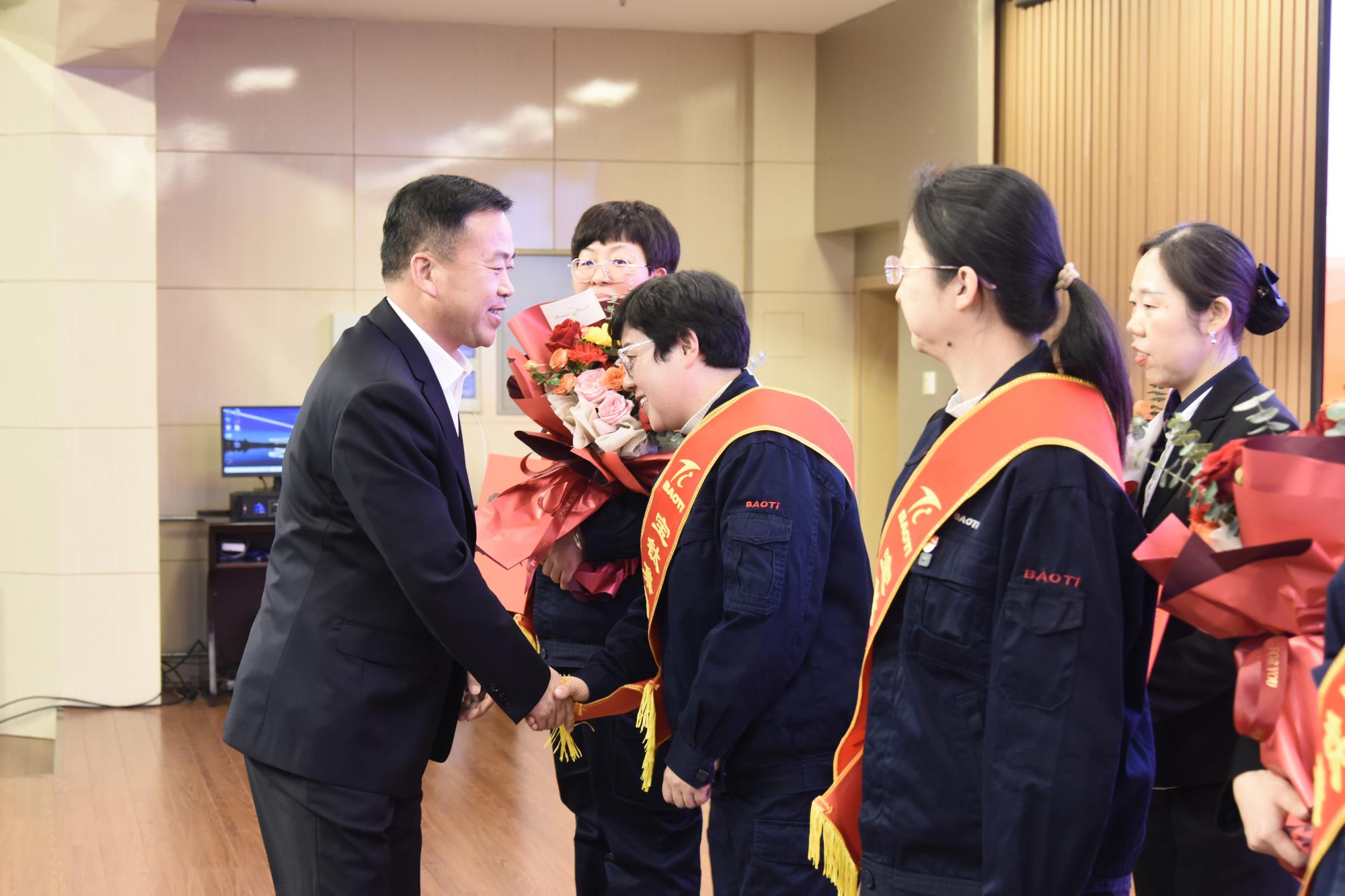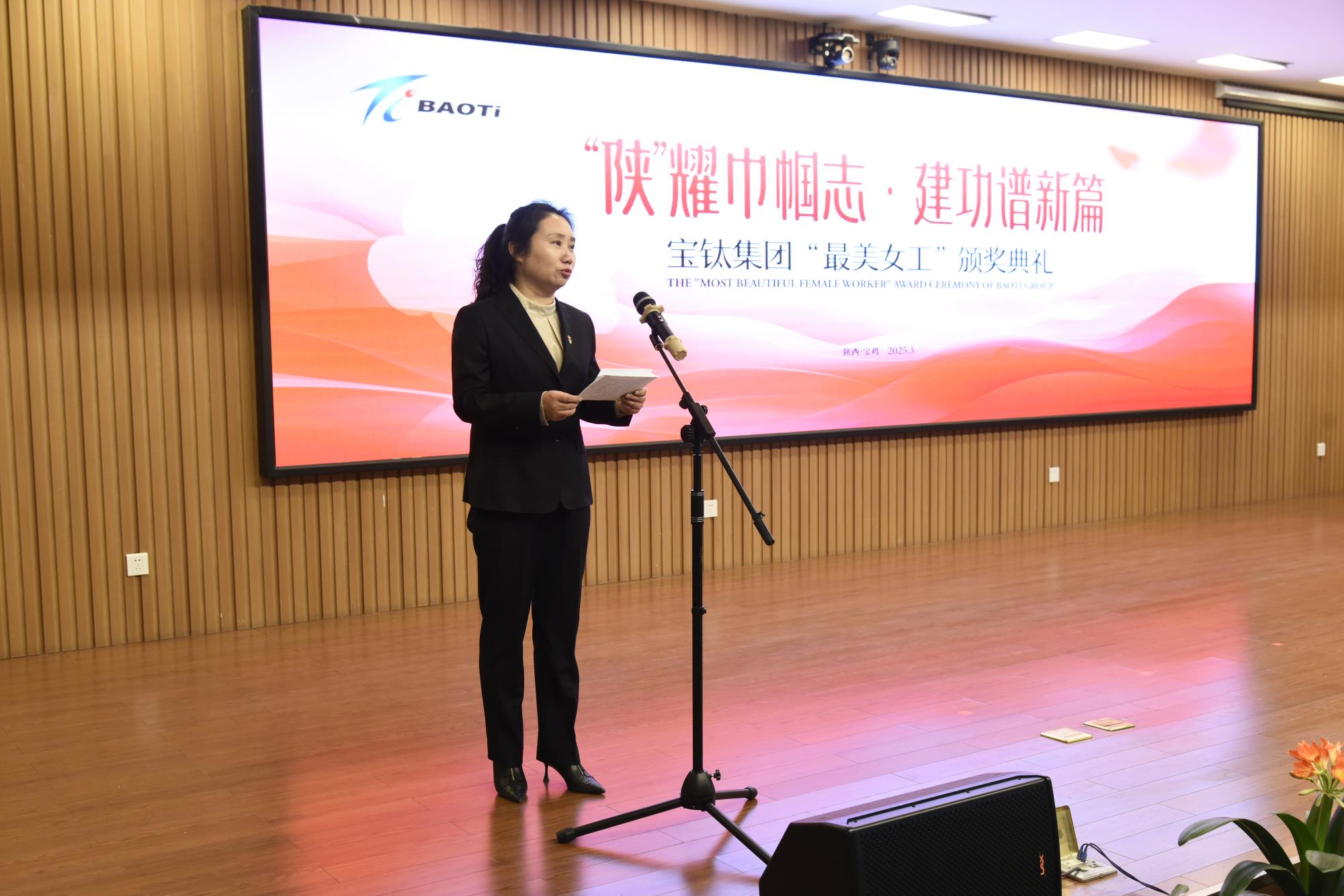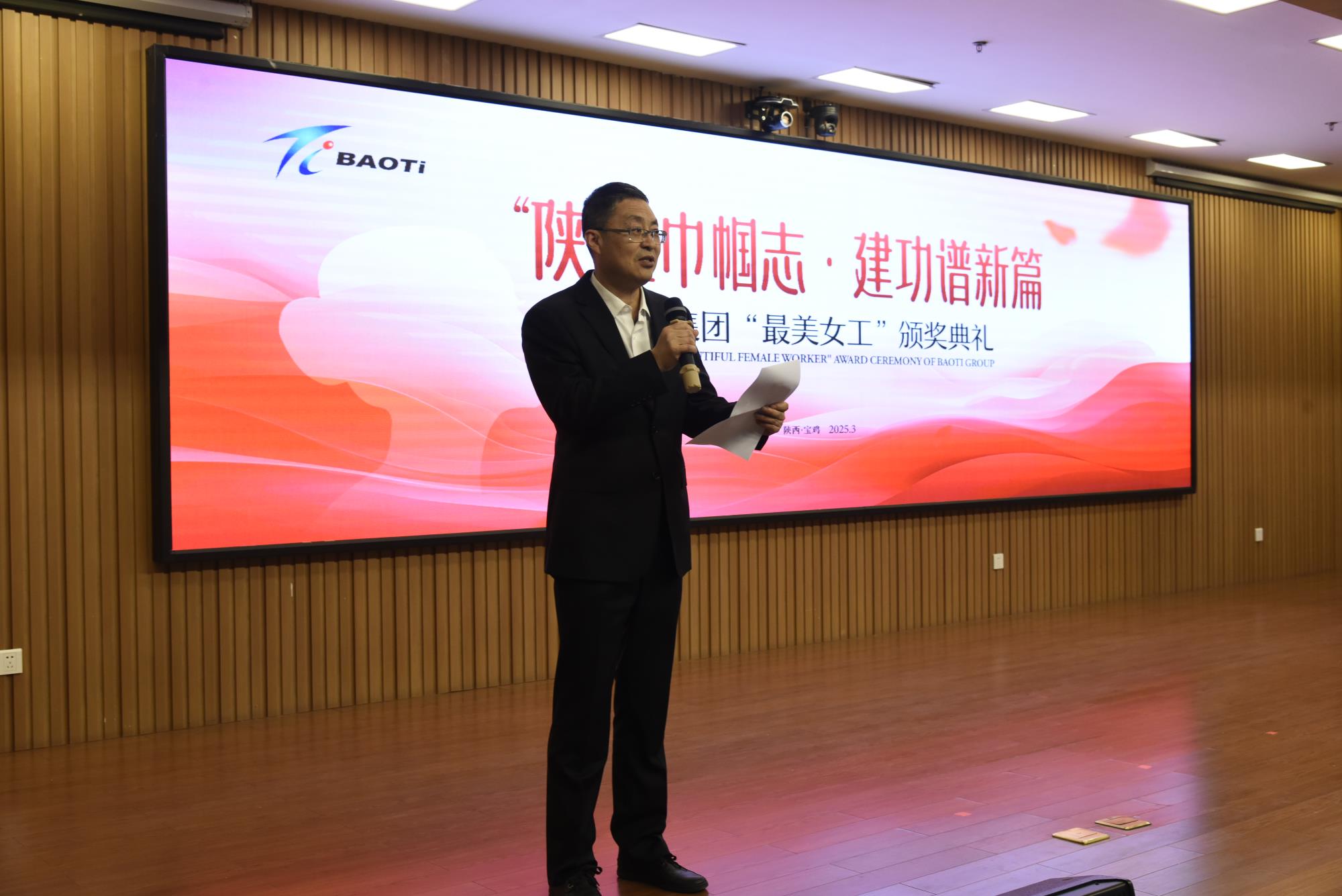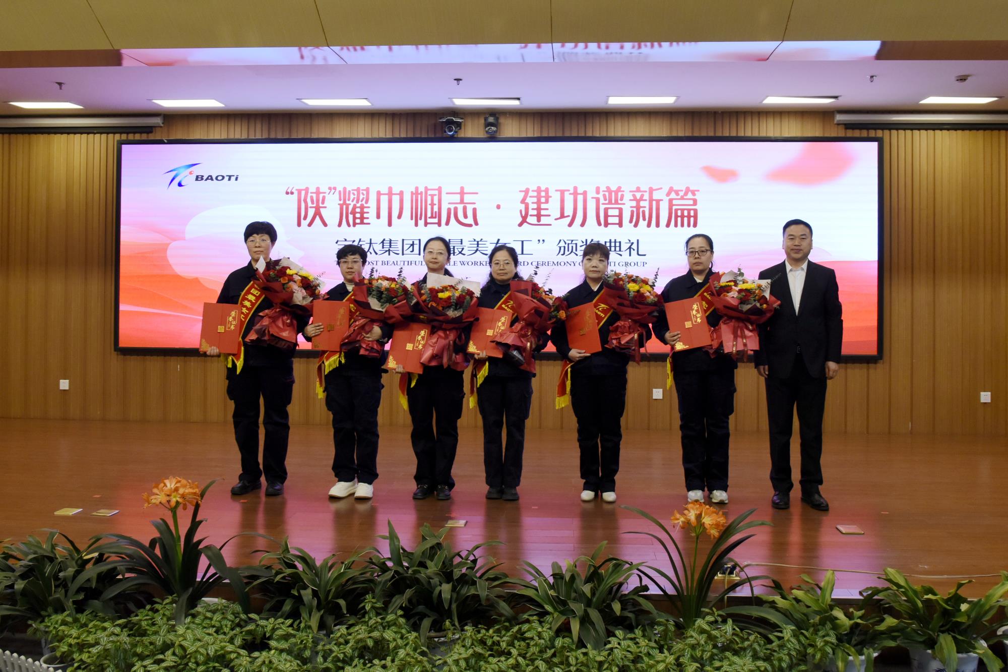 3月12日下午,由宝钛集团工会女职委精心策划组织,以 “‘陕’耀巾帼志 建功谱新篇”为主题的宝钛集团“最美女工”颁奖典礼在宝钛宾馆七楼学术报告厅盛大举行。宝钛集团党委副书记、工会主席贺治民出席活动并为“最美女工”颁奖。宝钛集团工会副主席田周平宣读表彰决定。宝钛集团工会女职委副主任、女工部部长杜薇华致辞。