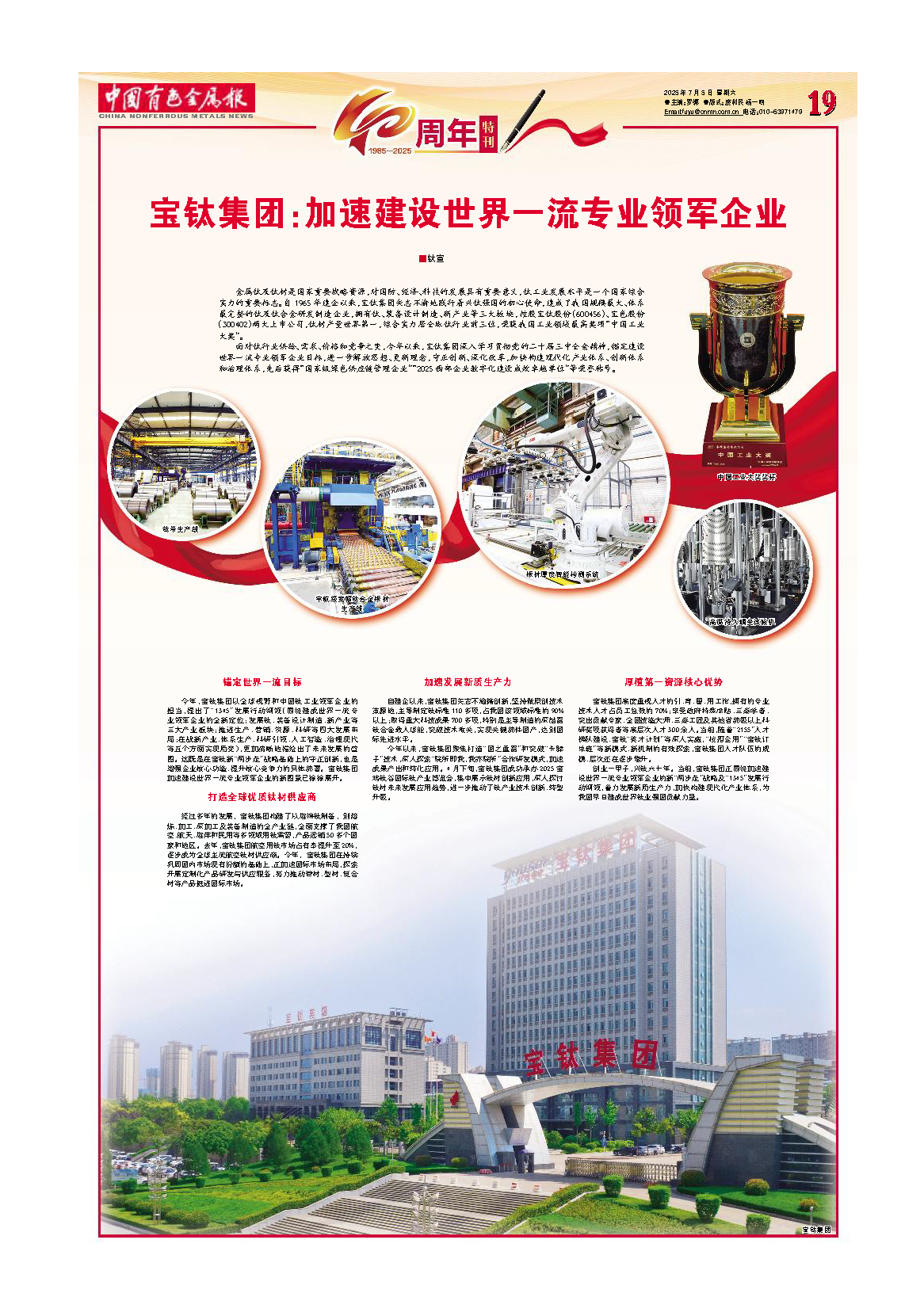 创业一甲子,兴钛六十年。当前,宝钛集团正围绕加速建设世界一流专业领军企业的新“两步走”战略及“1345”发展行动纲领,着力发展新质生产力,加快构建现代化产业体系,为我国早日建成世界钛业强国贡献力量。
