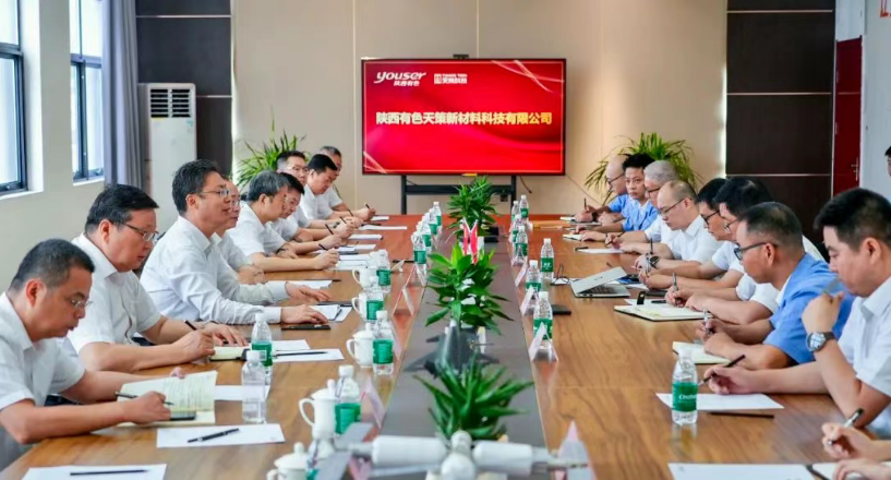 揭牌仪式前,吴群英一行在有色天策公司党支部书记、董事长孙胜奇,总经理张建国陪同下调研了公司产品展室和生产线,此后举行了座谈会。吴群英指出,有色天策公司揭牌是有色集团天策公司的重大转折点,标志着天策公司进入新阶段,一是企业性质变化,按国企管理运行,“国企品质+市场机制”,实现了强强联合、融合互补;二是发展能力变化,“资金链+技术链+人才链”必将越来越充实;三是作风形象变化,靠高质量作风打造和展示“依法合规+现代企业+高端企业”新形象。有色天策公司要体现新作为,一是战略规划要实在可行,回答好产品序列、技术和装备序列、效能序列三个问题,清晰确定“十五五”规划发展目标和路径;二是技术迭代突破领先,树雄心、立壮志,通过技术升级、迭代达到产品“白菜价”;三是市场份额巩固提高,强化市场开发意识,坚持“六性原则”“六优化”“六同步”,以优质和低成本牢牢占领市场。要收获新业绩,一是经营“质效量”倍增,把行业单项冠军旗帜牢牢拿在手上;二是新技术突破布局,从功能参数提高、成本下降两方面衡量技术迭代,人无我有、人有我优,做行业标准的制定者;三是现代治理体系成熟,围绕核心功能增强、核心竞争力打造,把人才资源、科技研发、市场开发、国企优势融合起来,扬各自优势。集团公司将从产供销、科技研发、人才队伍等方面全力支持有色天策公司创中国沥青基碳纤维单项制造业冠军。