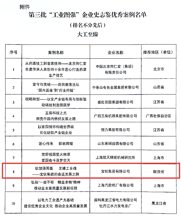 经前期认真筹备,近日,宝钛集团成功入选工信部工业文化发展中心第三批“工业图强”企业史志鉴优秀案例名单。
