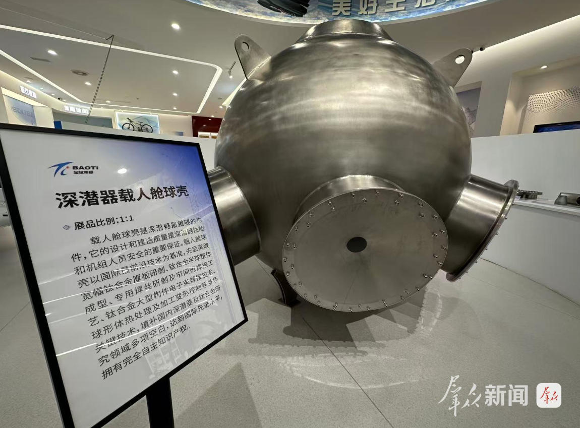 9月23日,走进宝钛集团,展览馆内硕大的深潜器载人舱球壳模型将时间线拉回5年前。2020年11月,装有宝钛研制生产的钛合金载人球舱的“奋斗号”载人潜水器在马里亚纳海沟成功坐底10909米,创造我国载人深潜的新纪录。