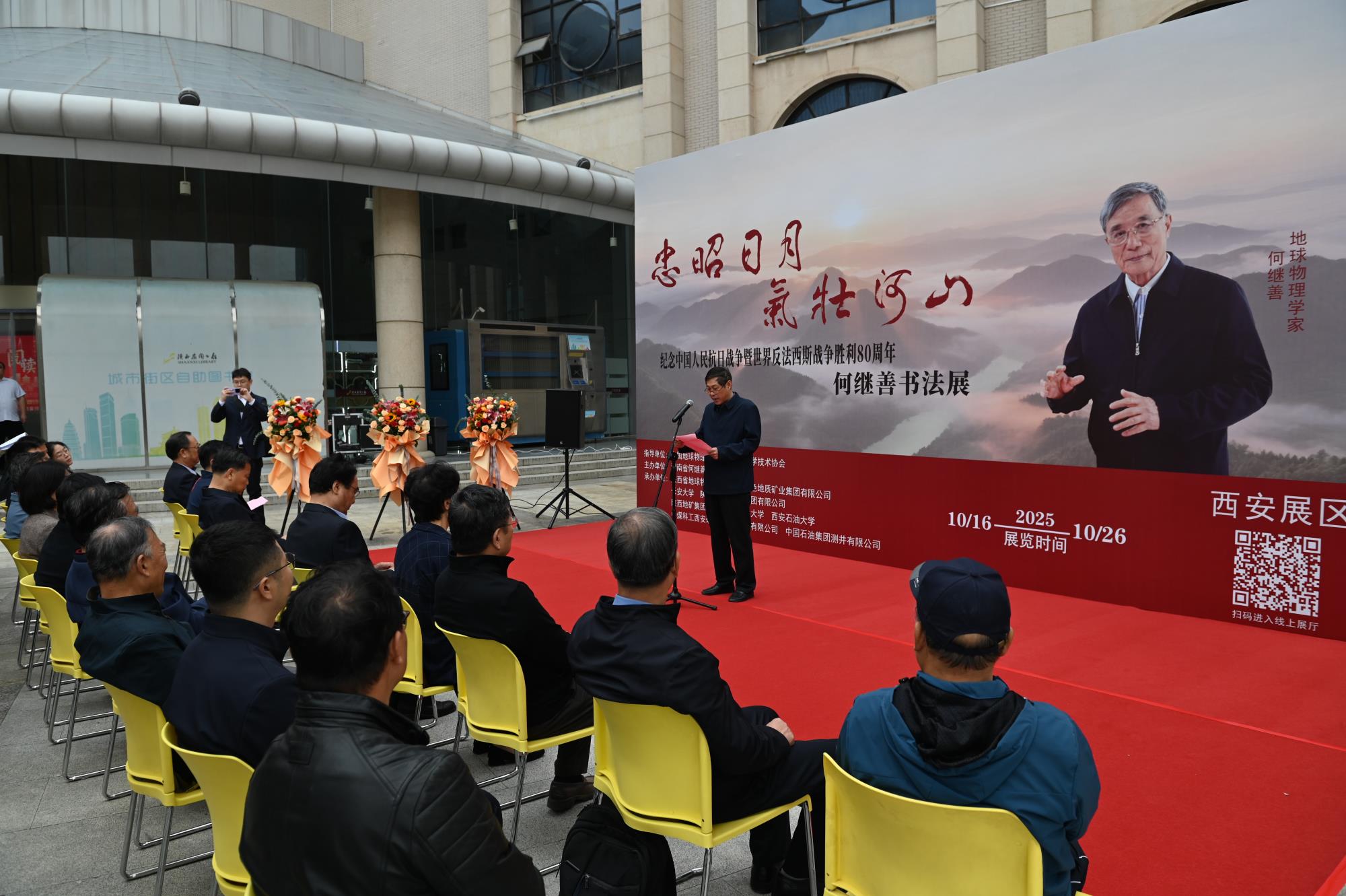 10月16日上午,“忠昭日月 气壮河山——纪念中国人民抗日战争暨世界反法西斯战争胜利八十周年”何继善院士书法巡回展(西安展)在陕西省图书馆开幕。