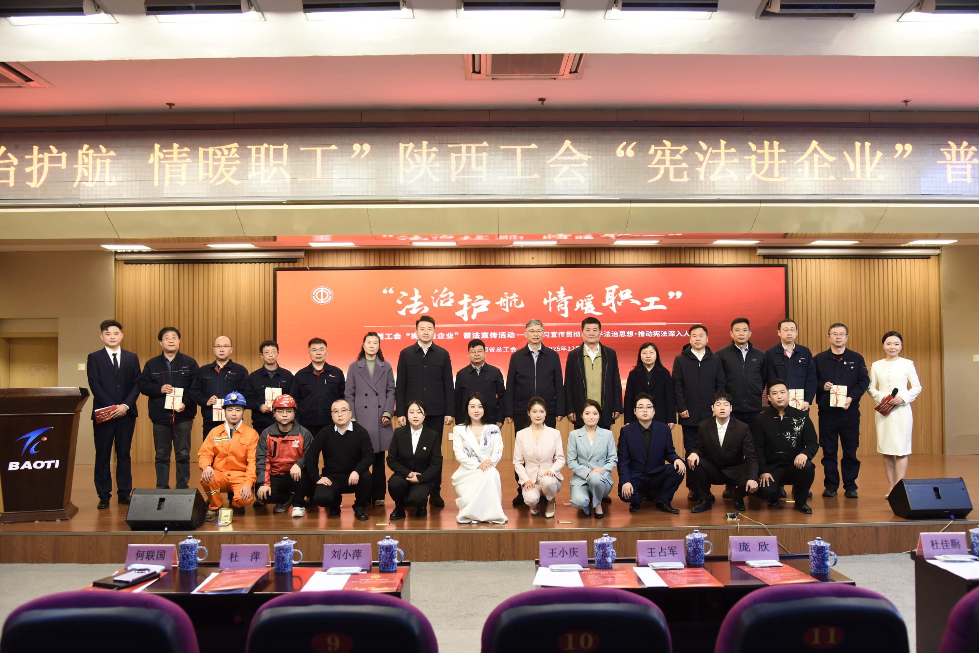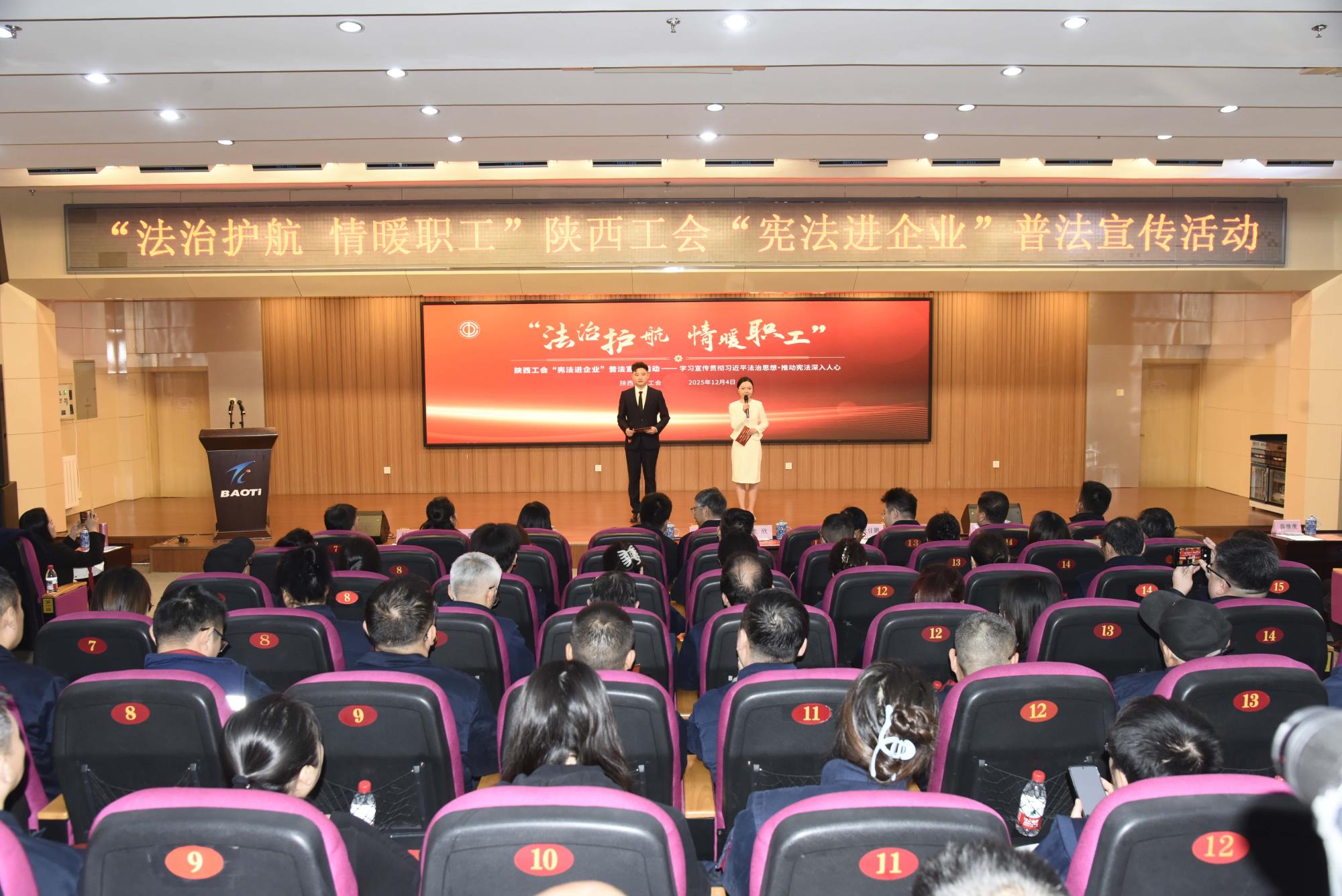 12月4日,第十二个国家宪法日当天,由陕西省总工会主办,省机械冶金建材工会、宝鸡市总工会协办的“法治护航·情暖职工”陕西工会“宪法进企业”普法宣传活动在宝钛集团宝钛宾馆七楼学术报告厅举行。