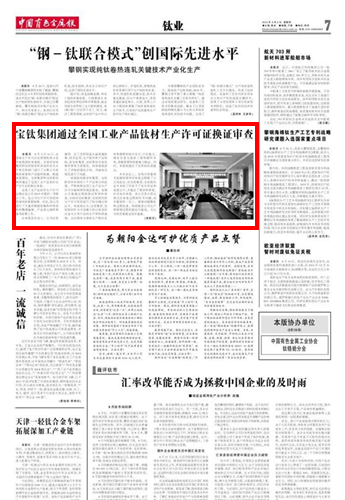 8月5日~6日,由国家生产许可认证管理机构4名专家组成的审查组,分别对宝钛集团和宝钛股份所涉及的有关生产单位和部门进行了为期2天的现场审查和产品抽样检测。根据审查情况,宝钛集团和宝钛股份顺利通过了全国工业产品钛材生产许可证的换证审查。