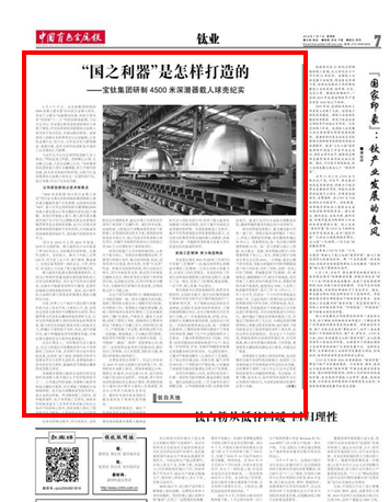 6月1日~7日,由宝钛集团研制的4500米载人潜水器TC4钛合金载人球壳,参加了主题为“创新驱动发展、科技引领未来”的国家“十二五”科技创新成就展,习近平总书记、李克强总理等党和国家领导人参观了展览,对宝钛研制的深潜器钛合金载人球壳给予充分肯定,并提出殷切希望。国家领导人到展台来参观和对企业的勉励,让有色金属行业、钛行业,尤其是宝钛人群情激奋、备感自豪,是对宝钛科技创新及中国钛工业发展的巨大鼓舞。