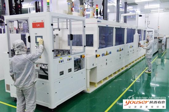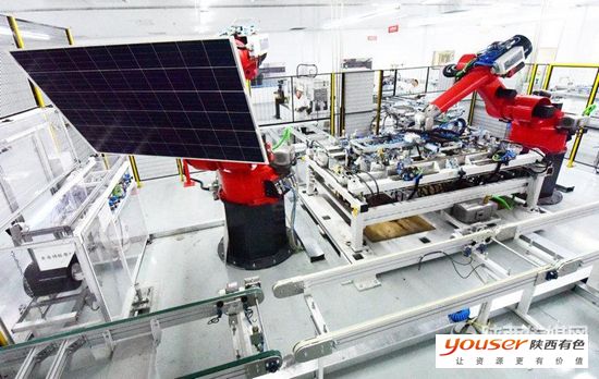 11月16日,在陕西有色光电科技公司光伏电池组件生产线上,员工正在借助引进德国的徕斯六轴机器人进行作业。该公司1GWp太阳能光伏电池项目一期今年初陆续试车试产,面对不利的宏观经济环境和复杂多变的光伏市场形势,公司克难奋进,爬坡过坎,实施创新驱动战略,实现了试产运营的良好开局,2016年有望完成销售收入25亿元。